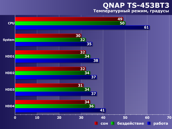 Последние два теста касаются энергопотребления и температурного режима. В них также использовалась конфигурация из четырех винчестеров в режиме RAID5, как наиболее востребованная.