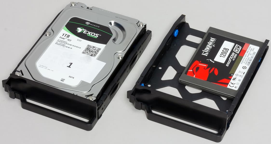 Единственное, что стоит отметить, это наличие в базовом варианте модели QNAP TS-453BT3 четырех отсеков для жестких дисков и двух для SATA SSD формата M.2. Это позволяет более гибко выбирать конфигурацию дисковых томов.