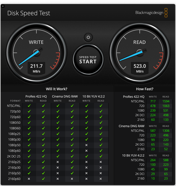 Как мы видим, максимальные скорости чтения почти достигают значения в 600 МБ/с. По мнению тестовой утилиты, этого достаточно для работы со многими вариантами контента формата 4K. На записи максимальные показатели примерно в два раза ниже, но и их достаточно для записи некоторых вариантов 4К-видео. Работа напрямую через порт Thunderbolt 3 является более эффективной, чем через дополнительный сетевой адаптер. Так что последний может быть интересен только в случае необходимости работать именно через сетевой коммутатор 10 Гбит/с (например, если сетевых накопителей несколько), а не напрямую.