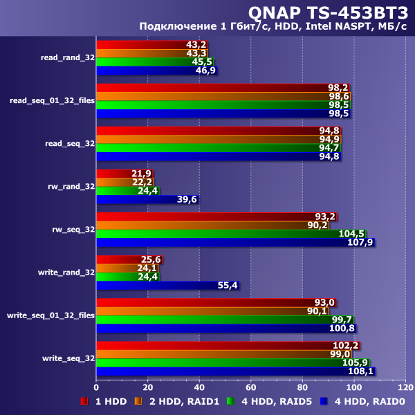 Рассматриваемая модель имеет достаточно производительную платформу для эффективной реализации отказоустойчивого массива с четностью, да и жесткие диски давно перешагнули рубеж в 100 МБ/с. Так что в большинстве случаев производительность на последовательных операциях при работе на сети 1 Гбит/с ограничивается именно сетью. Да и в других случаях (за исключением массива с чередованием, который мало кто будет использовать на практике) скорости всех конфигураций совпадают.