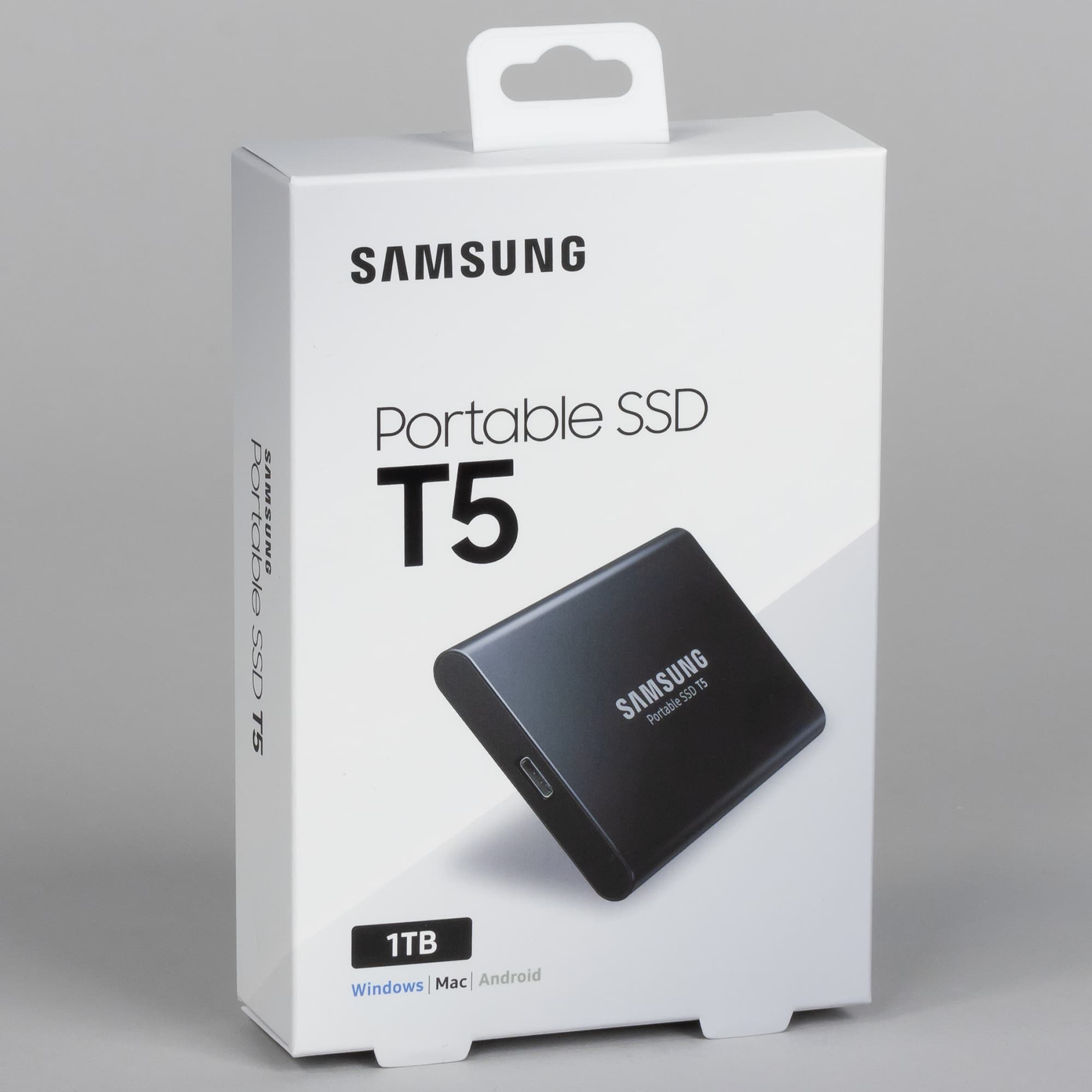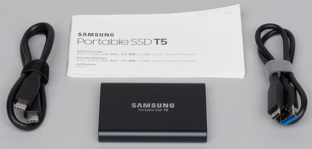 Кстати, о кабелях. В обзоре упомянутого ESD220C мы пожаловались на то, что в комплекте только один кабель Type-А—Type-С, а Type-С—Type-С придется приобретать отдельно. Для T3 это замечание тоже было справедливо, а вот при переходе к Т5 в Samsung его учли: в коробке есть оба актуальных кабеля. Соответственно, независимо от того, к чему планируется подключать устройство, дополнительно ничего приобретать не нужно (за исключением, может быть, случая смартфона/планшета с Micro-USB, но им скоростные возможности внешних SSD не нужны, поскольку они ограничены USB 2.0).