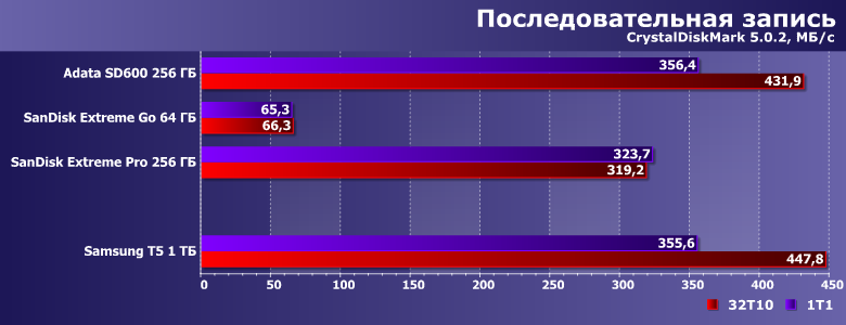 Поскольку некоторое время назад мы меняли тестовый стенд, сравнивать тестируемые устройства особо не с кем — накопление результатов только началось. Да и ранее внешних SSD такой емкости не тестировали, так что в этот раз для сравнения взяли не конкурирующие в прямом смысле слова накопители, а пару быстрых флэшек (SanDisk Extreme Go 64 ГБ и SanDisk Extreme Pro 256 ГБ) и внешний SSD на 256 ГБ (Adata SD600), благо нашлись «под рукой».