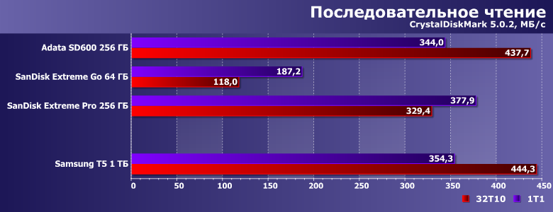 Пара внешних SSD остается в явных лидерах и в плане последовательных операций. По крайней мере, с точки зрения низкоуровневых утилит, что неудивительно — тут скорость зачастую уже лимитирует только SATA-интерфейс, к которому добавляются ограничения USB-моста.