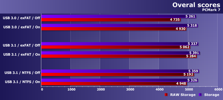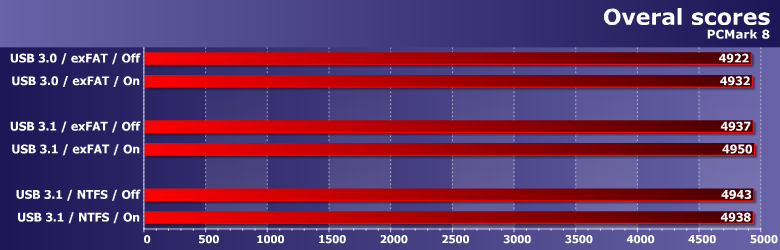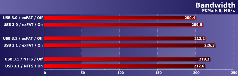 Обычно для внешних накопителей мы ограничиваемся PCMark7, однако в этот раз решили воспользоваться и более новой версией тестового пакета, оперирующей более «тяжелыми» нагрузками — все-таки внешний SSD для такой работы подходит куда лучше, чем обычная флэшка или USB-винчестер. Хорошо заметно, что «на верхнем уровне» разницы между тестовыми сценариями нет. Конечно, если взять лупу и приглядеться к результатам внимательно, то некоторые закономерности найти можно. Например, USB 3.1 быстрее, чем USB 3.0 — удивительно :) Или включение кэширования записи снижает производительность при использовании exFAT, но увеличивает ее для NTFS — вот это уже и без шуток удивительно. Но в целом разброс результатов столь мал, что на него можно вообще не обращать внимания.
