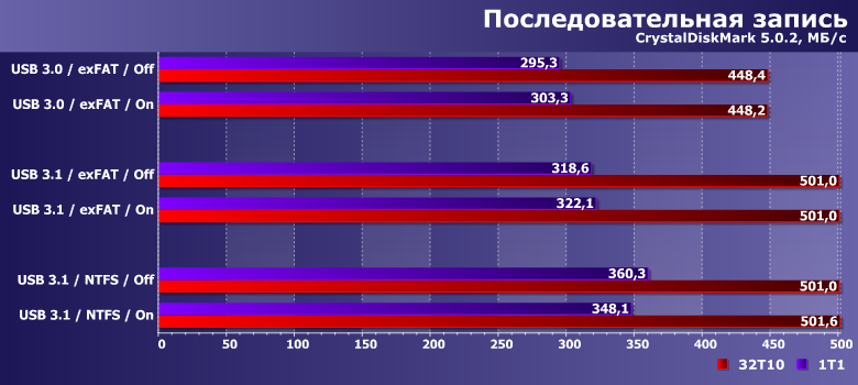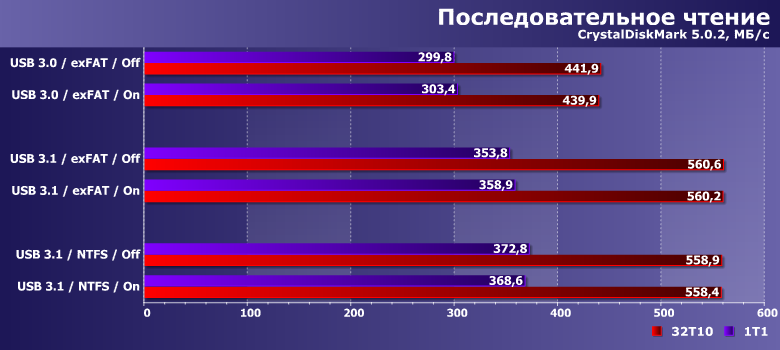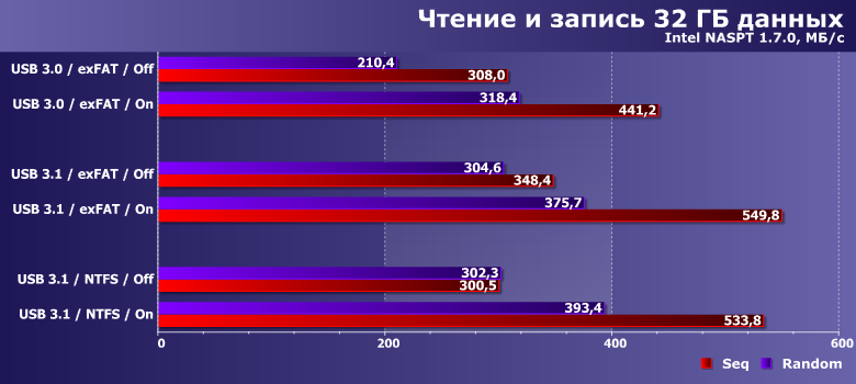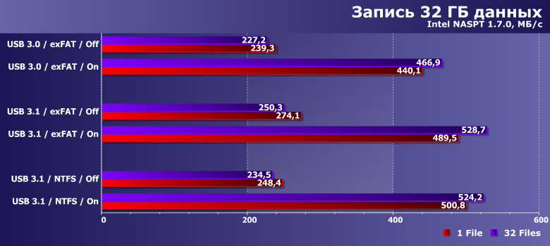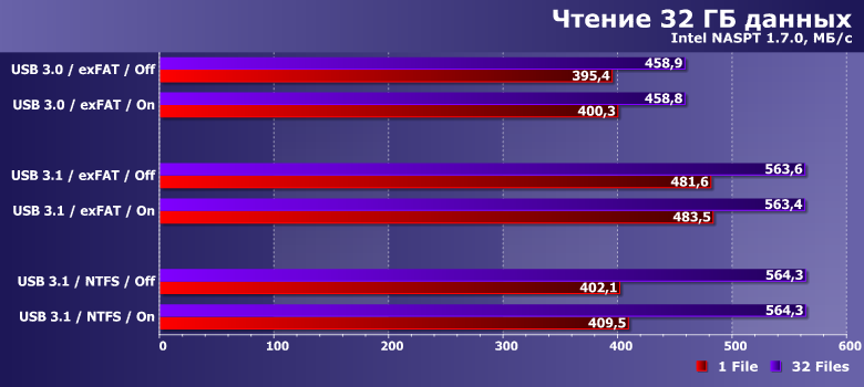 Как и следовало ожидать, интерфейс здесь имеет значение, а вот политика кэширования — нет, поскольку речь идет об операциях чтения. При этом на NTFS скорость чтения одного файла в однопоточном режиме оказывается существенно более низкой, чем на exFAT — настолько, что это может компенсировать разницу между скоростными режимами USB. А вот при параллельном чтении в 32 потока всё так, как и должно быть. И полностью соответствует результатам низкоуровневых утилит.