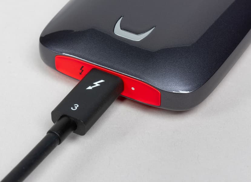 Напомним, что Thunderbolt 3 (в отличие от предыдущих версий стандарта) использует разъем Type-C — впервые появившийся в спецификациях USB 3.1. Подобная «универсальность» позволяет некоторым пользователям пытаться подключить Thunderbolt-устройство к USB-порту, а потом удивляться, что ничего не работает. И не должно! Более того (плохая новость), кабели легко перепутать, хотя это справедливо только для взгляда со стороны, но не в работе: если воспользоваться именно USB-кабелем, то Х5 в системе будет виден как абстрактное USB-устройство, но работать не будет. С другой стороны (а вот это хорошая новость), Thunderbolt-кабель является универсальным, его можно использовать и для подключения USB-устройств (причем к обычным USB-портам Type-C тоже).