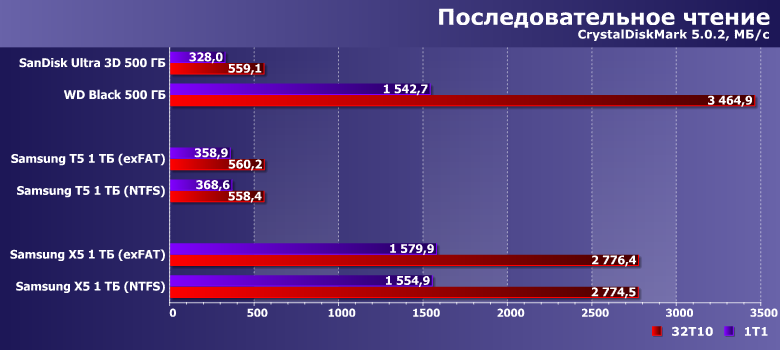Кроме того, мы протестировали и пару внутренних устройств — дабы наглядно показать, что современные внешние интерфейсы способны не ограничивать производительность. Наилучшим образом бы нам подошли терабайтные SSD Samsung 850 Evo и 970 Evo, поскольку их можно непосредственно противопоставить Т5 и Х5 соответственно, но их под рукой не оказалось. Поэтому мы ограничились SanDisk Ultra 3D (SATA600) и WD Black (PCIe 3.0 x4) по 500 ГБ каждый — в своих классах это тоже быстрые устройства, так что подойдут.