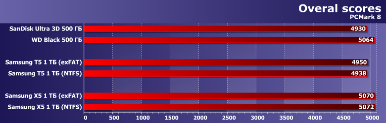 Обычно для внешних накопителей мы ограничиваемся PCMark7, однако он отказался работать на Х5, так что пришлось воспользоваться более новой версией тестового пакета (тем более, результаты Т5 в нем получили в прошлый раз). На высоком уровне все примерно одинаковы — как обычно. Впрочем, даже тут несложно заметить, что оба SATA-накопителя (и неважно — используется этот интерфейс непосредственно или через USB-мост) это одна группа, а оба NVMe (опять же — независимо от способа подключения) — другая. Чуть более быстрая.