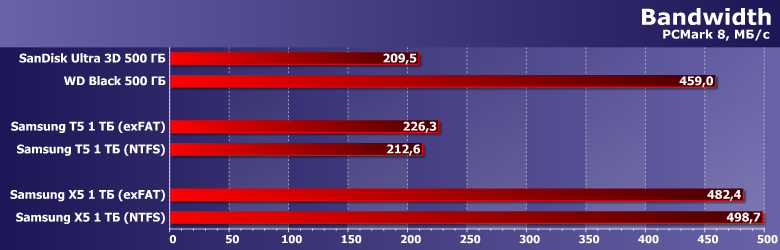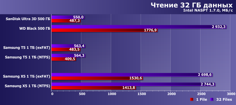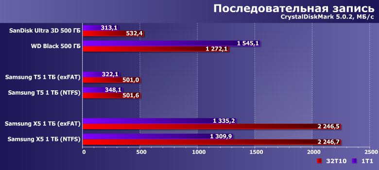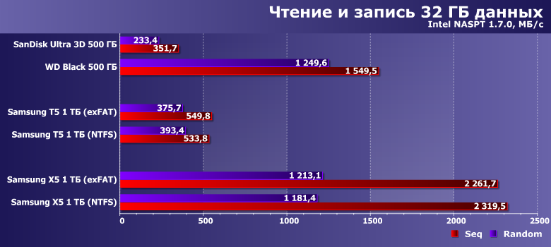При записи интерфейс оказывается «узким местом» только для SATA-накопителей (и то не всегда), так что тут уже Х5 сумел заметно опередить WD Black. Да — меньшей емкости. Но это все равно значимое достижение — оказывается, внешние SSD могут быть более быстрыми, чем установленные внутрь компьютера NVMe-накопители (не говоря уже обо всех прочих).