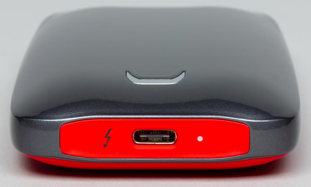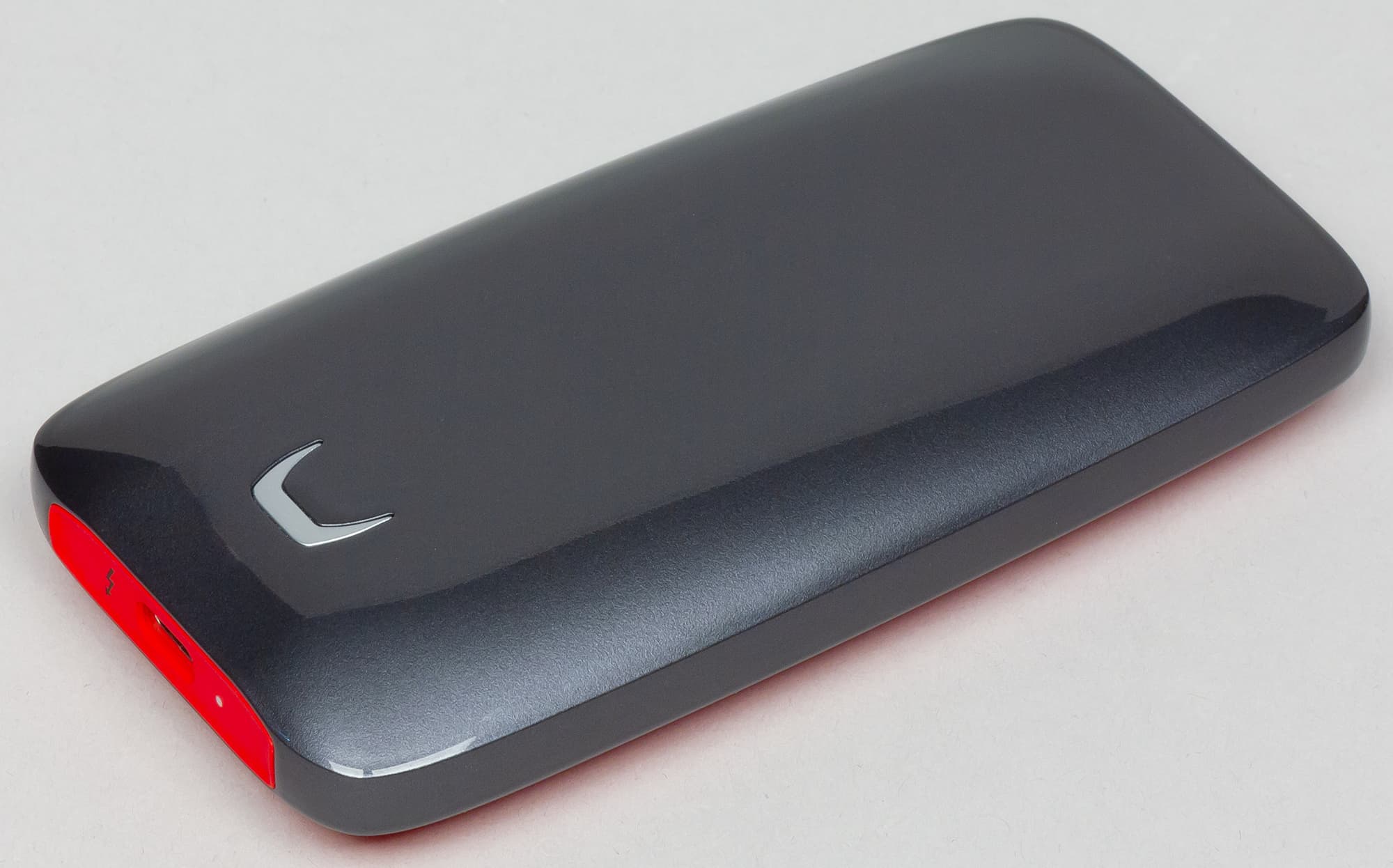 В общем, текущий уровень цен сильно похож на желание застолбить рынок, не слишком налегая на собственно продажи. Поэтому здесь и далее привязываться к ценам мы не будем (во избежание разжигания), а ограничимся технической составляющей. Тем более, что и с ней на первый взгляд не все гладко — в частности, Х5 на фоне того же Т5 выглядит настоящим мастодонтом: 119×62×20 мм при массе 150 г — это далеко не 74×57×11 мм и 51 г. Честно говоря, мы видели и винчестеры покомпактнее и полегче. Но произошло это вовсе не из-за прихоти дизайнеров: просто NVMe-накопители при работе могут серьезно нагреваться (это совсем не SATA-устройства, «горящие в полнакала»), да и мосты Thunderbolt высокой экономичностью не отличаются. В итоге официально для устройства заявлено энергопотребление до 2,5 А при 5 В — вспоминаем, что многие винчестеры и почти все USB-флэшдрайвы спокойно обходились даже 0,5 А 5 В у USB 2.0, и перестаем удивляться.