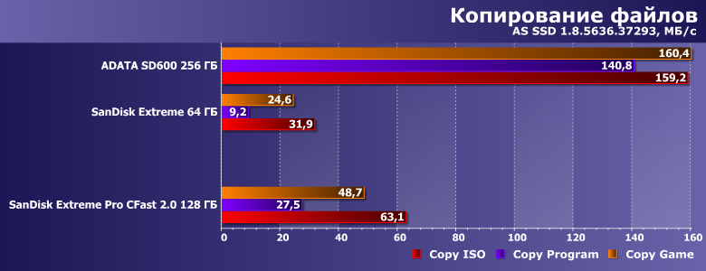 Для сравнения скоростных показателей мы взяли недавно протестированный внешний SSD AData SD600 как оценку сверху. Карта же SanDisk Extreme 64 ГБ во многих тестах должна оказаться намного более медленной — это очевидно уже из сравнения пропускной способности интерфейсов, а теоретические 167 МБ/с для современного флэша «высокого уровня» однозначно мало. Во всех случаях мы будем использовать USB 3.0, так что и собственные ограничения этого интерфейса для всех трех участников тестового набора будут одинаковыми.