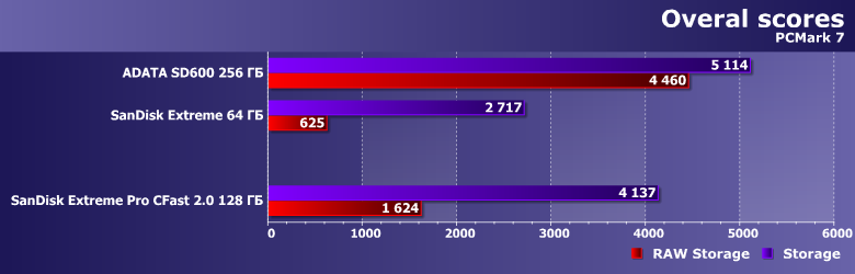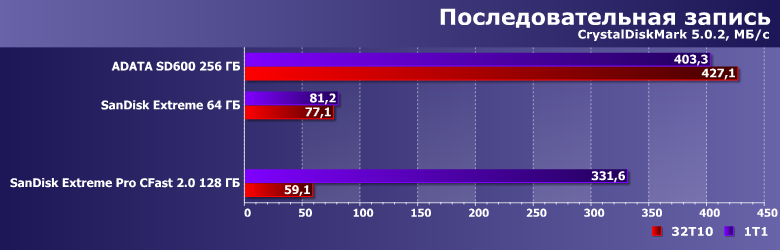 Скорости получились более низкими, чем в бенчмарках низкого уровня, однако все равно очевидно, что на 200-300 МБ/с рассчитывать можно точно — даже в не самых удобных режимах. Сменных носителей же с такими скоростями на рынке буквально три типа, причем для SD UHS-II это фактически теоретический потолок. А «классический» CompactFlash и в теории на такое был неспособен.