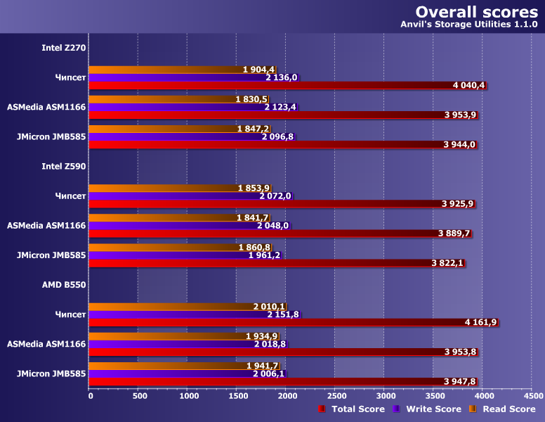 Но главное тут, конечно, сравнение чипсетов. И волноваться не о чем — на новой системе диски, по крайней мере, медленнее не станут. Вот дискретные контроллеры работают помедленнее — по-видимому, сказалось усложнение контроллера PCIe в «навороченных» современных чипсетах, но это как раз не слишком принципиально. В любом случае, единственным аутсайдером можно считать как раз старичка Z270 — так что на что его не меняй, а все равно хорошо. Чего и достаточно.