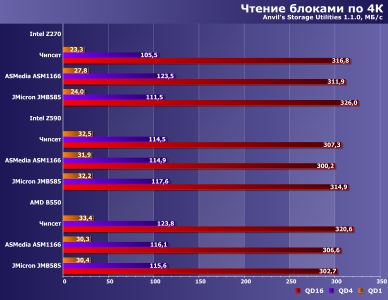 Казалось бы, SATA600 интерфейс старый — и ничего нового тут не придумаешь. Однако нашлось — и речь не только о чипсетных контроллерах. В частности, на новых платформах практически повсеместно выросла скорость однопоточного чтения. Многопоточное же традиционно упирается в пропускную способность интерфейса. Во всех случаях, кроме JMB585 на АМ4 — тут явно есть какие-то нюансы совместимости. Но окончательный вердикт будет выносить, когда с другими результатами ознакомимся.