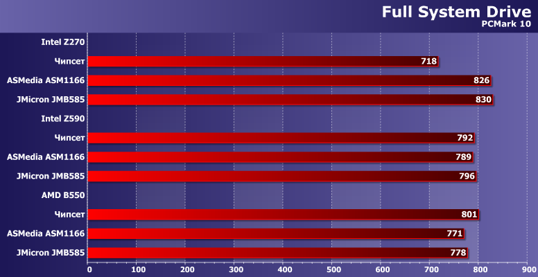 Использовать диски на дополнительных контроллерах в качестве «основных системных» в настоящее время в основном и не требуется: можно и другими воспользоваться. В том числе, и более производительными NVMe — для подключения которых как раз зачастую и требуется освобождать линии PCIe. Однако у нас сегодня на повестке дня не только дискретные, но и чипсетные контроллеры. Да и PCMark 10 — бенчмарк комплексный. В него входят не только тесты загрузки системы или приложений, но и банальное копирование данных. Более подробную информацию по рабочим нагрузкам можно получить из нашего краткого описания теста по ссылке, а сейчас — просто результаты.