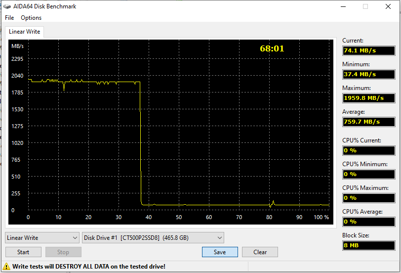 Но вообще клеймить позором KingSpec NX-512 на основании одного сценария рановато — на нем сказываются не только аппаратные характеристики, но и программные настройки прошивки. Собственная скорость памяти при записи ограниченная, так что преимущества быстрых интерфейсов приходится реализовывать SLC-кэшированием. И, чем больше кэш, тем больше данных можно записать быстро. Но тем серьезнее проблемы, если кэш уже кончится, а данные — еще нет. На примере Crucial P2 это видно отлично — здесь кэш на все ячейки, так что по его исчерпании скорость падает драматически: не умеет Phison E13T быстро расчищать место. Мы уже отмечали, что поведение этого SSD очень похоже на то, как себя ведут устройства на том же контроллере с QLC — где используется аналогичная же стратегия кэширования. В итоге на полную пропись уходит еще больше времени, чем у NX-512.