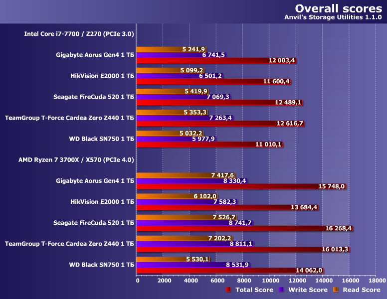 Однако тестировать накопители на базе Phison E16 только на «стандартном стенде» (Core i7-7700 на Z270) было бы, разумеется, идеологически неверным решением, поскольку главной их особенностью является поддержка интерфейса PCIe 4.0 x4. Поэтому ранее попадавшиеся нам терабайтники на этом контроллере (TeamGroup T-Force Cardea Zero Z440 и Gigabyte Aorus NVMe Gen4 SSD) мы тестировали также и на плате с чипсетом Х570 и процессоре AMD Ryzen 3700X. Кроме того, в такой конфигурации мы ранее протестировали WD Black SN750 1 ТБ с интерфейсом PCIe 3.0 x4, а сегодня добавим и результаты Hikvision Crius E2000 1 ТБ с таким же — но на Phison E12 и 64-слойной памяти Micron. Во всех случаях — при подключении непосредственно к процессорному контроллеру PCIe. Такое тестирование на двух платформах позволит точнее оценить — чего ждать от обновления интерфейса, а на чем больше сказывается сама платформа. В перспективе от этого можно будет и отказаться, но пока накопители с интерфейсом PCIe 4.0 интересны не только для работы в «родном» режиме, но и в «старых» платформах (коих на порядок больше), имеет смысл изучать их скоростные характеристики и так, и эдак.