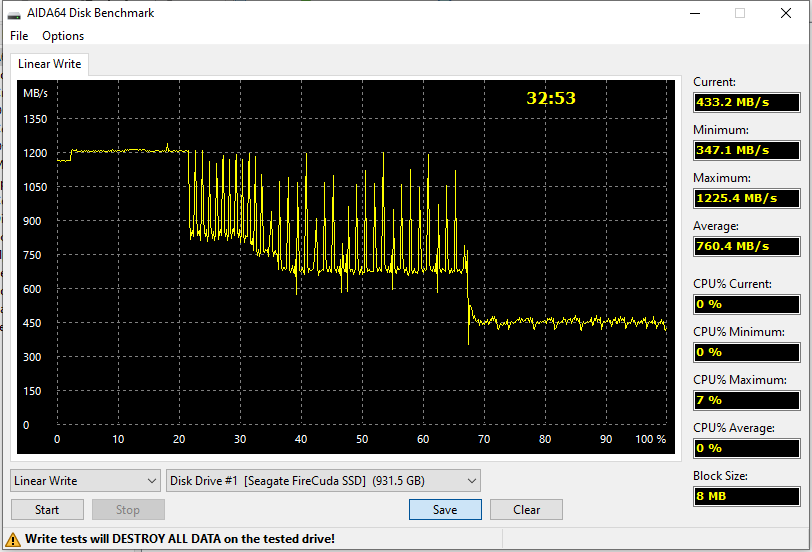 Максимальная скорость в пределах SLC-кэша. Как видим, никаких обещанных 2 ГБ/с в AIDA64 нет — а есть порядка 1,2 ГБ/с. Впрочем, и это существенно больше, чем можно прокачать через обычный Gen2 — так что есть за что побороться. А вот минимальная скорость — лишь немногим более 400 МБ/с. Это бы и в Gen1 влезло — так что при записи действительно больших объемов данных различия в производительности между устройствами с разными интерфейсами существенно уменьшаются. Но для внешника примерно 33 минуты на целый терабайт — очень хорошее значение: аналогичные внутренние модели (не страдающие от ограничений интерфейса, особенностей USB-контроллеров и т. п.) быстрее даже не вдвое. С другой стороны, та же BarraCuda Fast SSD медленнее тоже не в два раза и даже не в полтора. В общем, с быстрыми внешними устройствами не все просто — сделать такое можно, но выше определенного значения «выжимать» скорости все сложнее и сложнее. Особенно если пытаться добиться высокой производительности на всем объеме — к этому SSD на TLC и QLC не слишком готовы. Спасает то, что на практике это и не требуется особо — объемы записи все-таки ограниченные, а с чтением все SSD справляются очень быстро.