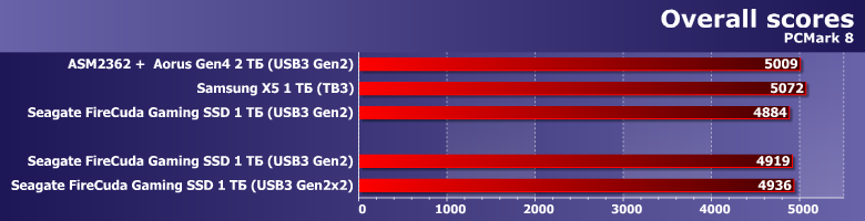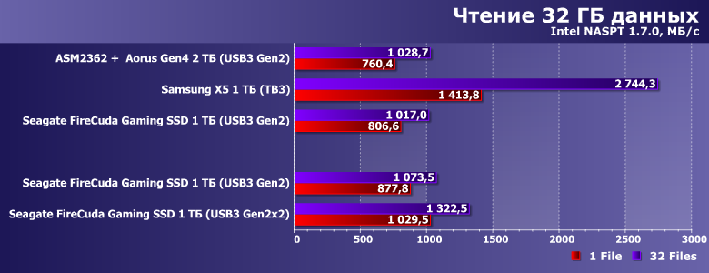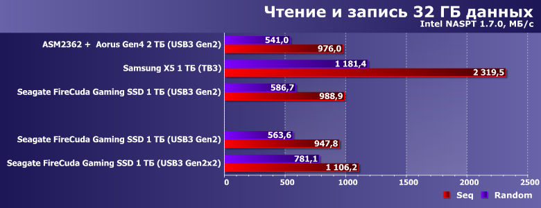В теории — могло бы. Но радикально от прочих отличается только Thunderbolt, что априори было очевидно: он в принципе быстрее и вообще работает немного на других принципах. А в остальном — на производительность в этом тесте влияет много факторов. Например, на одной платформе USB3 Gen2 и Gen2×2 различаются буквально на 10%. Если ограничиться первым, но в составе мини-ПК или ультрабука, производительность снижается. Хотя на деле — большего эффекта можно достичь использованием более быстрого SSD внутри: связка из ASM2362 и Aorus и на NUC работает быстрее, чем Seagate FireCuda Gaming на обеих платформах в обоих режимах.