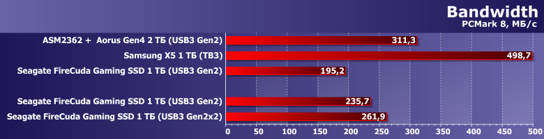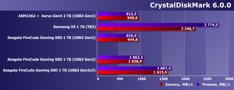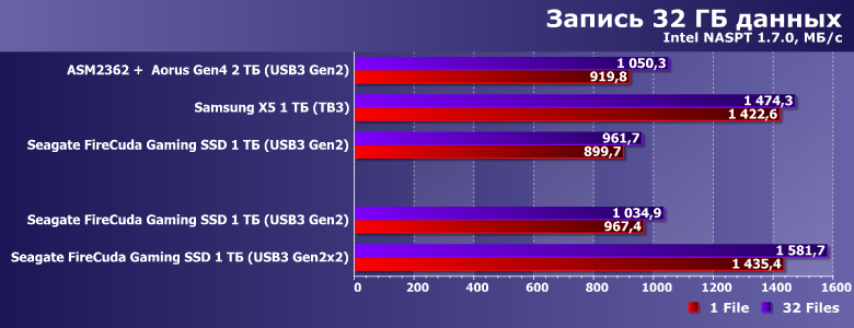 Поэтому первое тестирование мы решили сделать комбинированным. Seagate FireCuda Gaming SSD мы тестировали на двух системах. На «новой» — в режимах USB3 Gen2 и Gen2×2, на NUC — только в первом. А для сравнения мы взяли результаты пары накопителей, протестированных ранее на NUC: Samsung X5 с интерфейсом Thunderbolt 3 будет нужен для оценки сверху, а самосборный накопитель, собранный на базе ASM2362 в паре с очень быстрым Gigabyte Aorus NVMe Gen4 SSD 2 ТБ — как максимум для Gen2. Такой подход позволит нам наилучшим образом оценить перспективы USB3 Gen2×2 в современных условиях. А в дальнейшем мы этот вопрос расширим и углубим. В частности, результатами тестов, которыми ранее для тестирования внешних накопителей не пользовались.