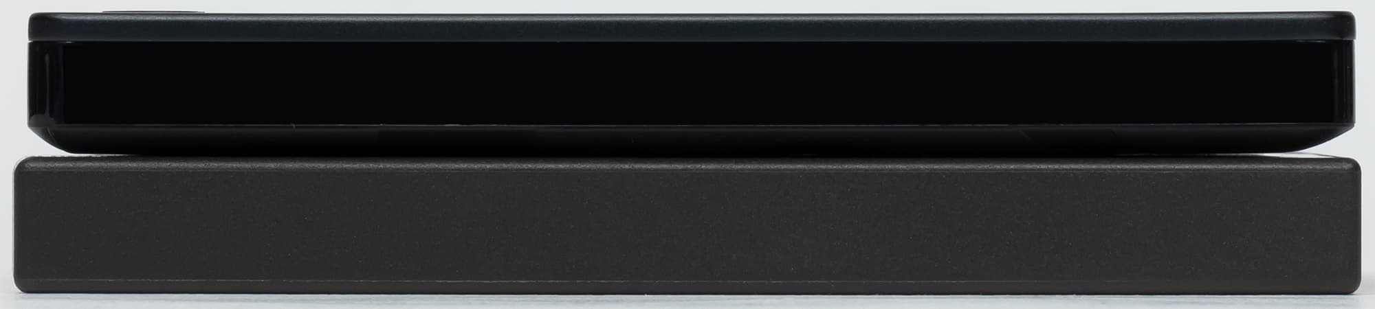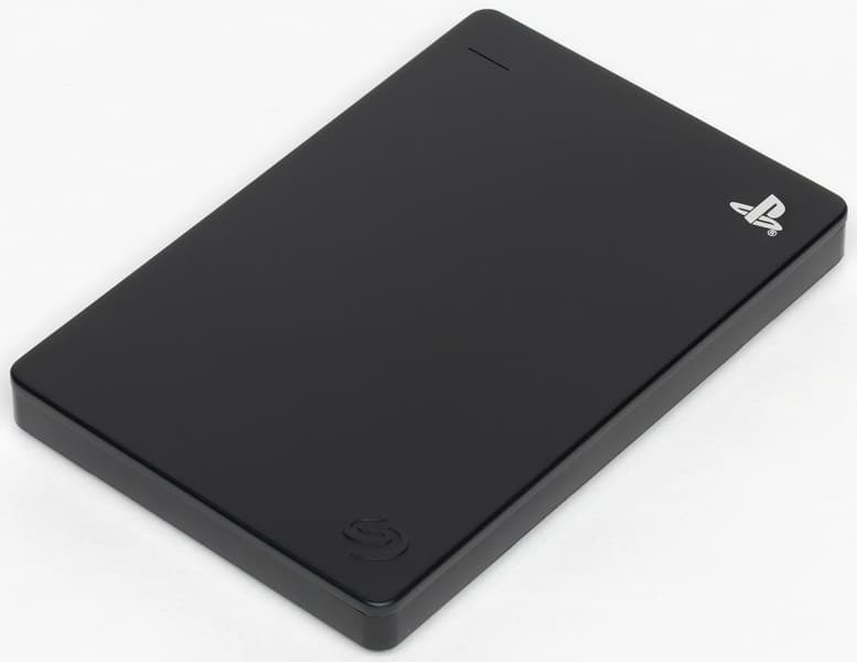 Внешне накопитель сильно напоминает недавно изученный нами Backup Plus Slim STHN2000401, что не удивительно — кто видел один портативный жесткий диск, тот видел их все. Основные отличия — радикально черный корпус (пластиковый с алюминиевыми вставками) немного других габаритов: 114×76×12 мм, 149 г против 115×78×12 мм, 126 г. На лицевой поверхности логотип Seagate переехал в нижнюю часть, а на его месте появилось лого PS4.