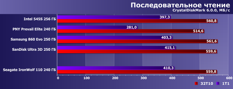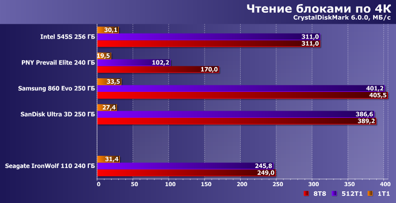 Чтение хорошо дается всем современным SSD практически на любых типах памяти, что тоже можно считать «побочным эффектом» технологии — специально этого добиваться не требуется. Примечательно, что «однопоточная» производительность за прошедшие годы даже несколько подросла, ну а при чтении в несколько потоков она уже давно «уперлась» в ограничения SATA600 и тут что-либо даже специально придумать сложно.