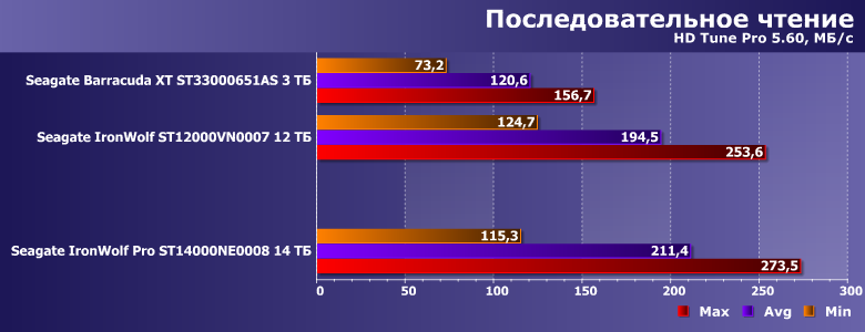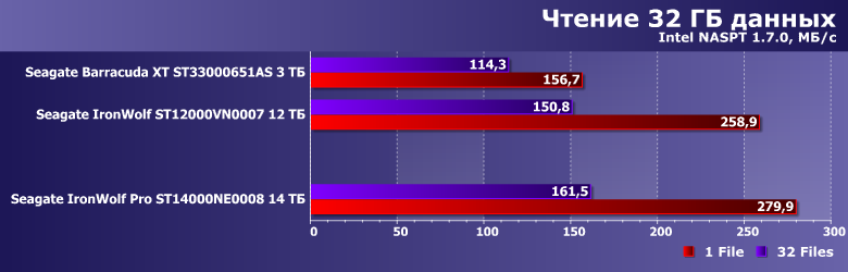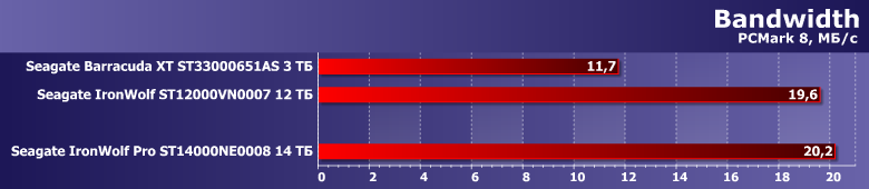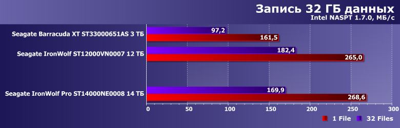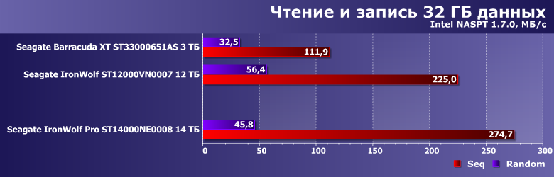 В целом же, независимо от позиционирования, модели одинаковой емкости в разных линейках (BarraCuda Pro, IronWolf, IronWolf Pro или не упомянутая выше серия SkyHawk для систем видеонаблюдения) очень похожи, причем и по скоростным характеристикам, в чем мы ранее убеждались. Увеличение емкости с 10 до 12, а теперь и до 14 ТБ эту политику не меняет. Поэтому для оценки нам подойдет любой представитель семейства. IronWolf Pro — просто самый «серьезный» по условиям. Ну и, в принципе, такая емкость именно для него в итоге как раз наиболее актуальна.