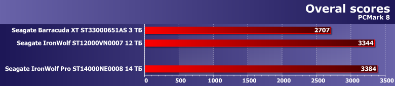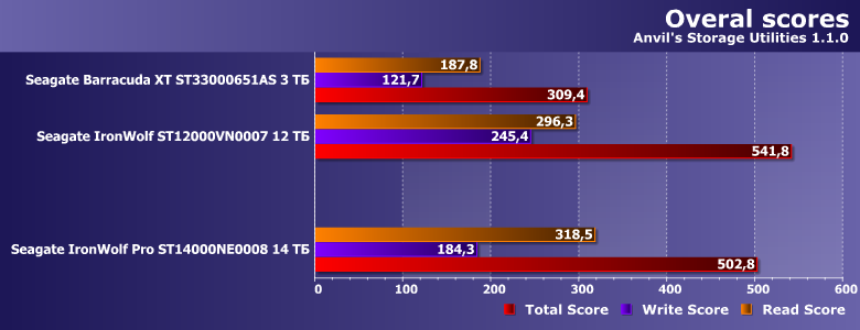 Некоторые операции записи низкого уровня на IronWolf Pro все-таки выполняются немного медленнее, чем ранее, так что и суммарный рейтинг у нового диска чуть ниже. Но ниже он не принципиально, это все тот же старый добрый винчестер: быстрее «совсем старых» винчестеров того же класса, но принципиально медленнее твердотельных накопителей. Зато он очень большой и относительно недорогой, так что по занимаемому пространству может «заменить» пяток предшественников, а по деньгам — SSD на пару терабайт (в лучшем случае — SSD на 4 ТБ, а тут все 14 ТБ).