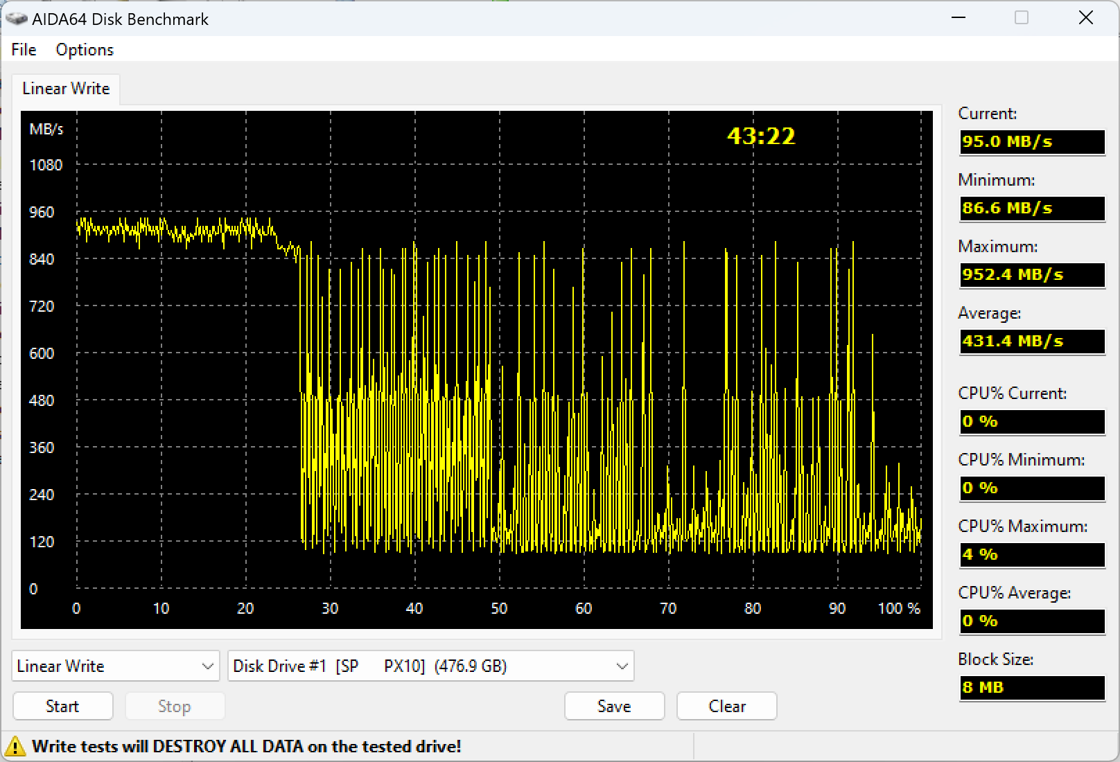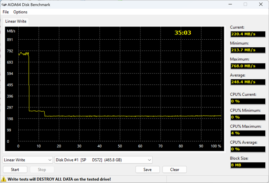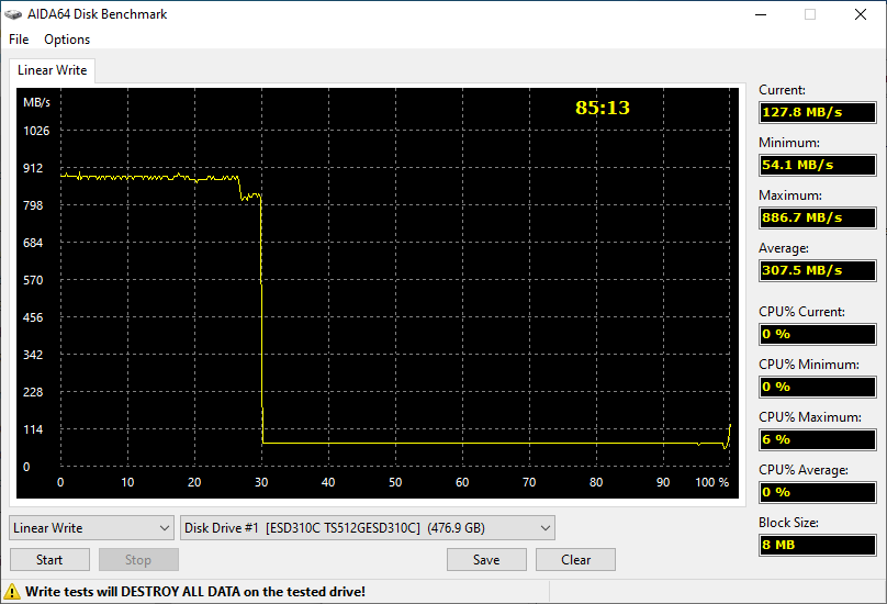 Иллюстрация того, что мы говорили выше — всё познается в сравнении. Transcend ESD310 тратит на запись той же половинки терабайта в два-три раза больше времени. Просто потому, что под кэш отводит все свободные ячейки, а дальше ему приходится долго и муторно кэш «упаковывать», продолжая принимать новые данные. Да еще и память довольно медленная — чтоб жизнь малиной не казалась. Какие 200 МБ/с — тут и стабильных 100 уже не получается.