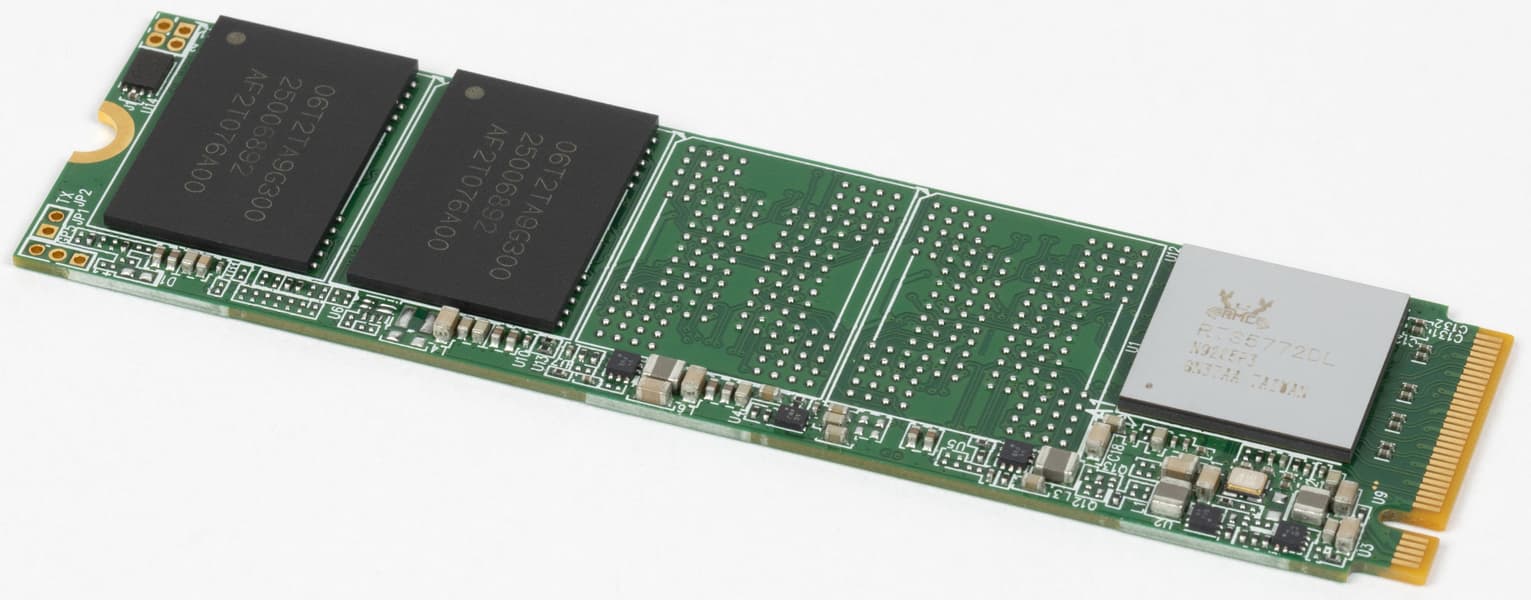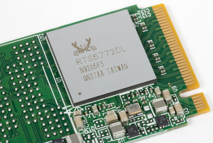 Но если SSD из нее уже извлечен, то все карты в руки. И не обязательно даже снимать наклейки — и программной идентификации достаточно, чтобы определить — попался нам контроллер Realtek RTS5772. Мы с ним уже знакомились, но только в паре с QLC-памятью, так что одна реперная точка в сравнении уже есть. Вкратце же напомним, что это Gen4-контроллер среднего класса — не слишком-то отличающийся от аналогичных продуктов Maxio, Phison или Silicon Motion. Не без недостатков, но они есть у любых четырехканальных безбуферных решений, поскольку их никто не «вылизывает» настолько тщательно, как топовые контроллеры.