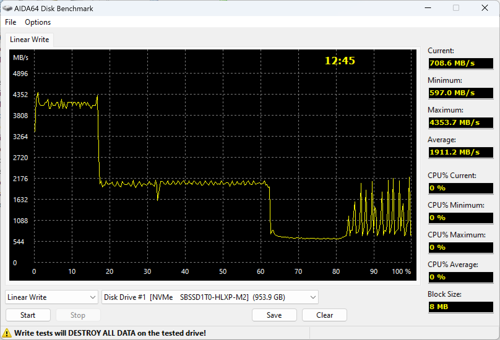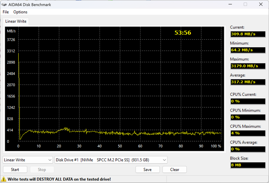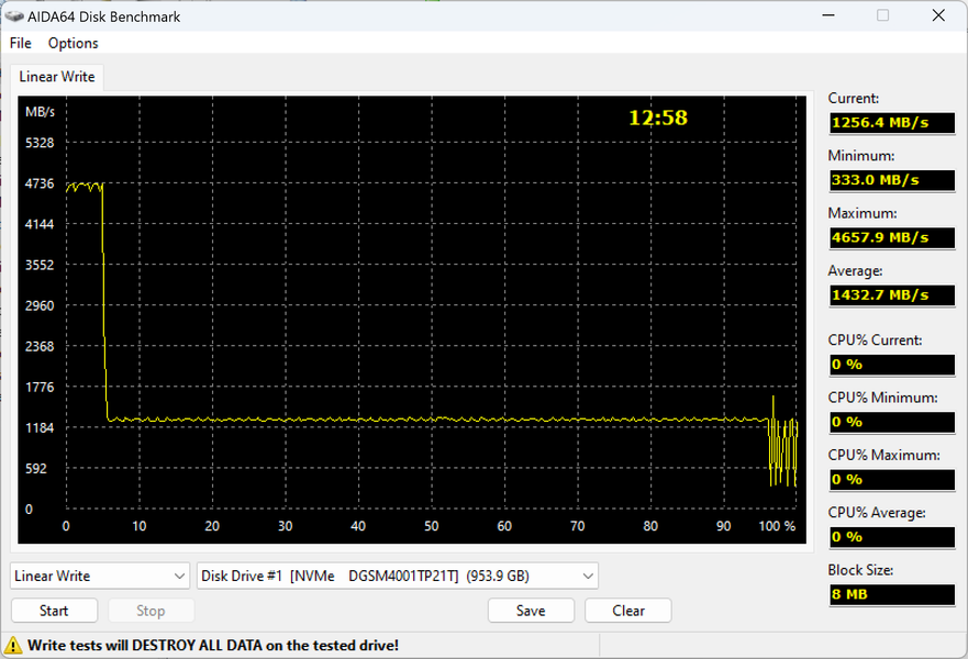 До заявленных 4800 МБ/с далеко и в пределах SLC-кэша, но это можно списать на особенности работы разных программ — максимум декларируется для какого-нибудь CrystalDiskMark в многопоточном режиме, что с алгоритмами работы AIDA64 перекликается примерно никак. Сам же график характерен для бюджетных контроллеров, пишущих данные только через кэш. Последний в таком случае имеет делать максимально большим, а что там при этом происходит за его пределами... производители никак не оговаривают, во-первых. Покупатели, эксплуатирующие такой накопитель в гордом одиночестве в недорогом компьютере в кэш обычно «попадать» будут, так что и никаких проблем не заметят. Тем более, что у этой платформы скорость записи и вне SLC-кэша не слишком высокая, но вполне приемлемая: три-четыре сотни мегабайт в секунду, конечно, уложились бы и в ограничения SATA, но это, опять же, для дня сегодняшнего обыденность. Точнее, лучше обыденности, но об этом чуть позже.
