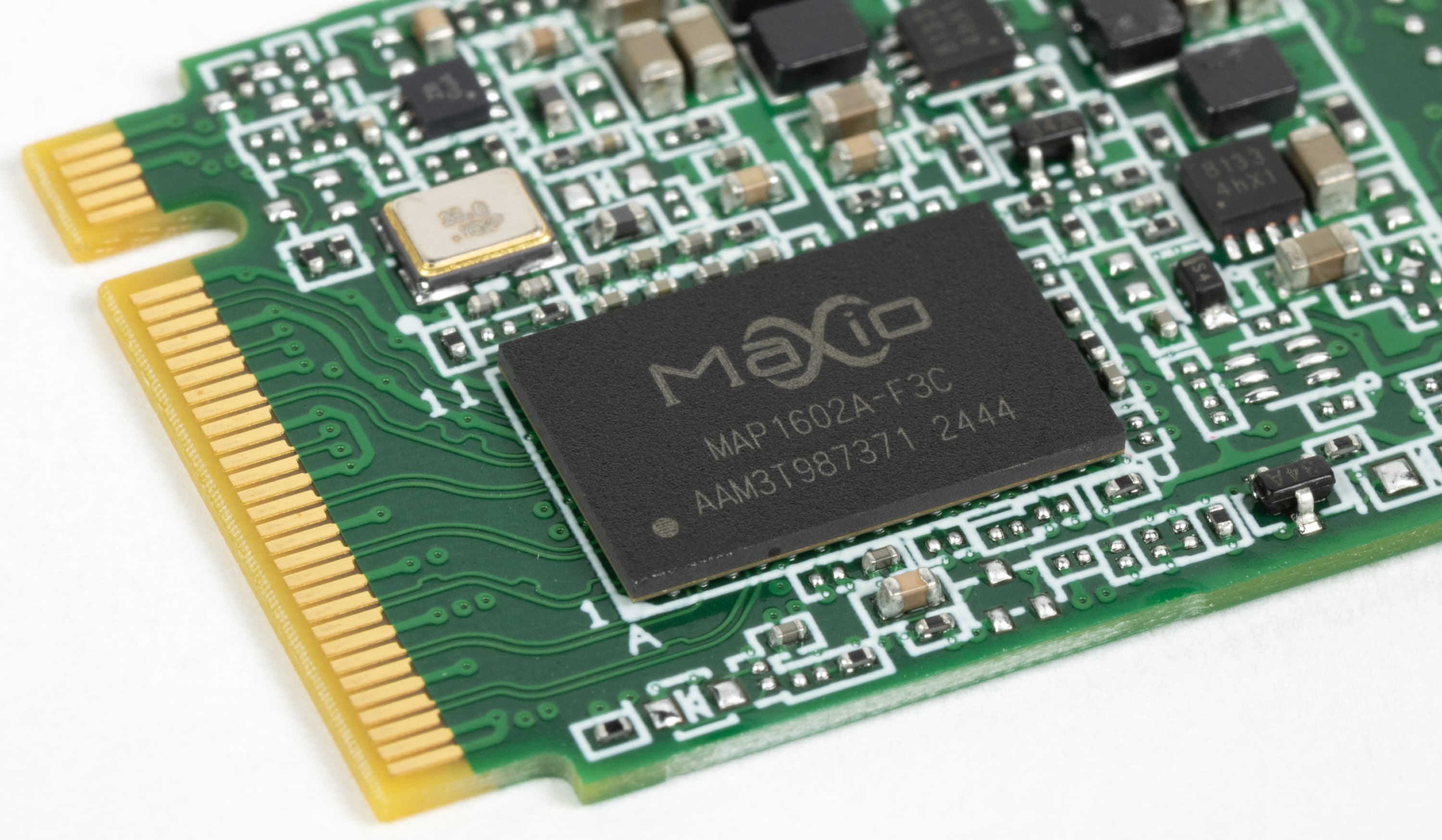 Нам же придется фронтальную наклейку удалить, дабы полюбоваться на расположенные под ней элементы. На первый взгляд, ничего необычного — типовая топология SSD на MAP1602 или MAP1608. Разве что текстолит здесь не привычно черный, а зеленый.