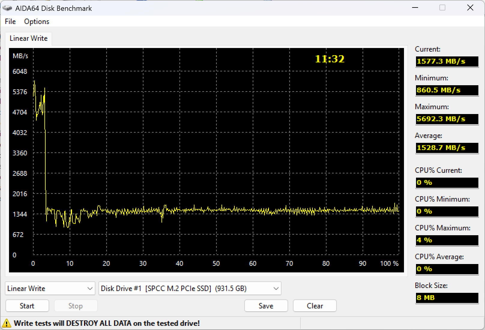 Для начала напомним — как в целом ведут себя SSD на MAP1602 с памятью YMTC. Некоторые флуктуации в зависимости от модели здесь бывают, но общие принципы хорошо видны по графику. Максимальная скорость записи — в пределах статической части SLC-кэша, далее динамика в размере половины или трети свободных ячеек (конкретный размер настраивает производитель), переход на режим прямой записи во флэш, расчистка кэша.