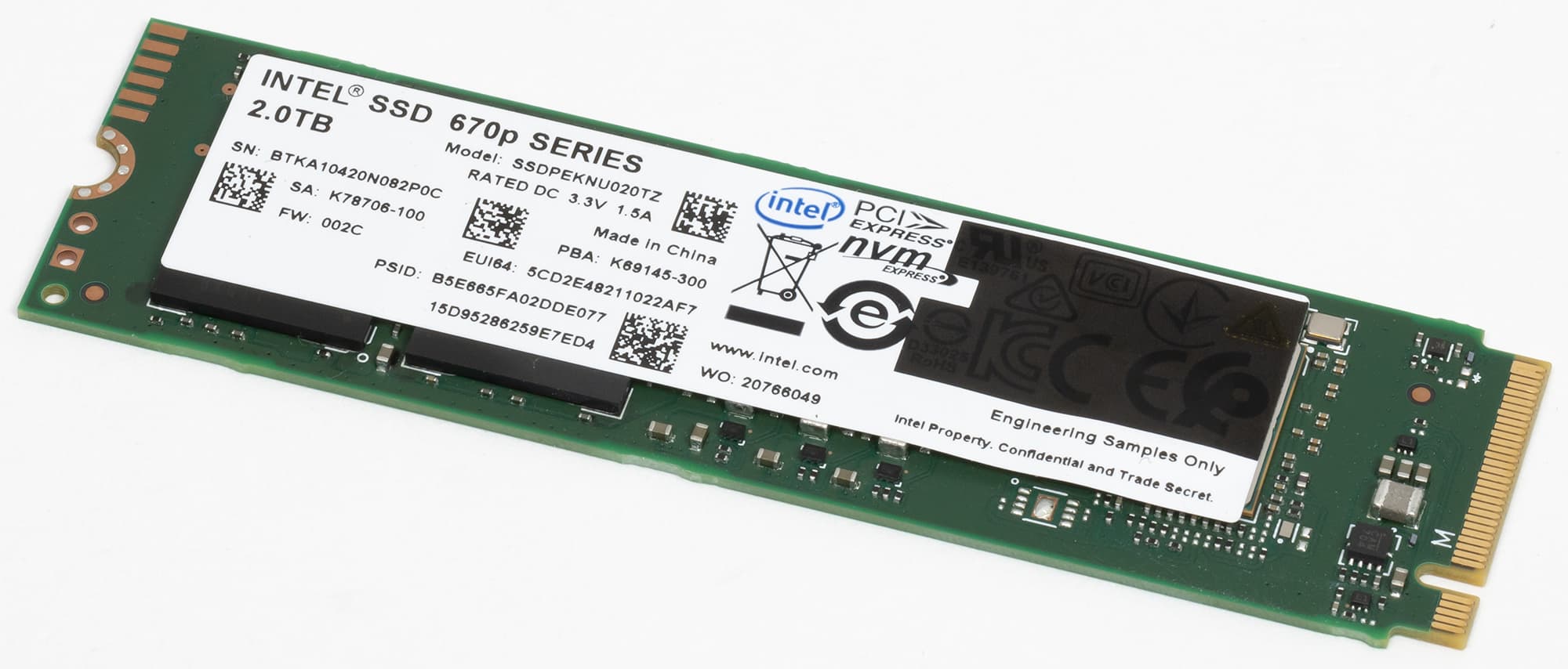 Для сравнения — 670p, тоже появившийся уже на излете работы того же подразделения в составе Intel. Сразу же в глаза бросается микросхема DRAM. Да — в 600-й серии Intel на ней не слишком экономил. Оставив за кадром вопрос, насколько внешний буфер вообще нужен в потребительских сценариях, просто вспомним, что безбуферным контроллерам не все до сих пор банально доверяют. А в 660p и 665p применялись Silicon Motion SM2263, но не чуть более дешевый SM2263XT. Вся экономия — 256 МБ DRAM вне зависимости от емкости SSD. Этот же подход перекочевал в 670p, но с контроллером получилось еще забавнее: Silicon Motion SM2265 более нигде на рынке не встречается. И немудрено — это всего лишь SM2267, которому отрубили (бесполезную в его случае) поддержку PCIe Gen4.