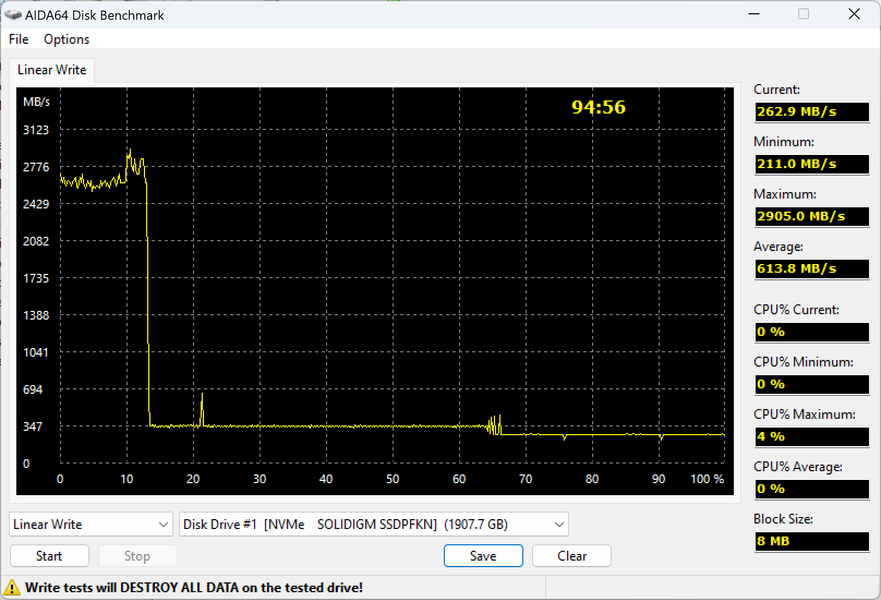 Solidigm P41 Plus в том же слоте Gen3 показывает, что спешить с переходом на Gen4 в общем-то было незачем — для записи уж точно. В остальном же график идентичный предшественнику — несколько минут только потеряли, зато немного приобрели в скорости записи в кэш. Второе заметить будет даже проще. В общем, поведение прошивок не изменилось — хотя иногда считается, что безбуферные контроллеры так не умеют. Действительно — чаще всего, не умеют. Но лишь потому, что их никто и не учит.