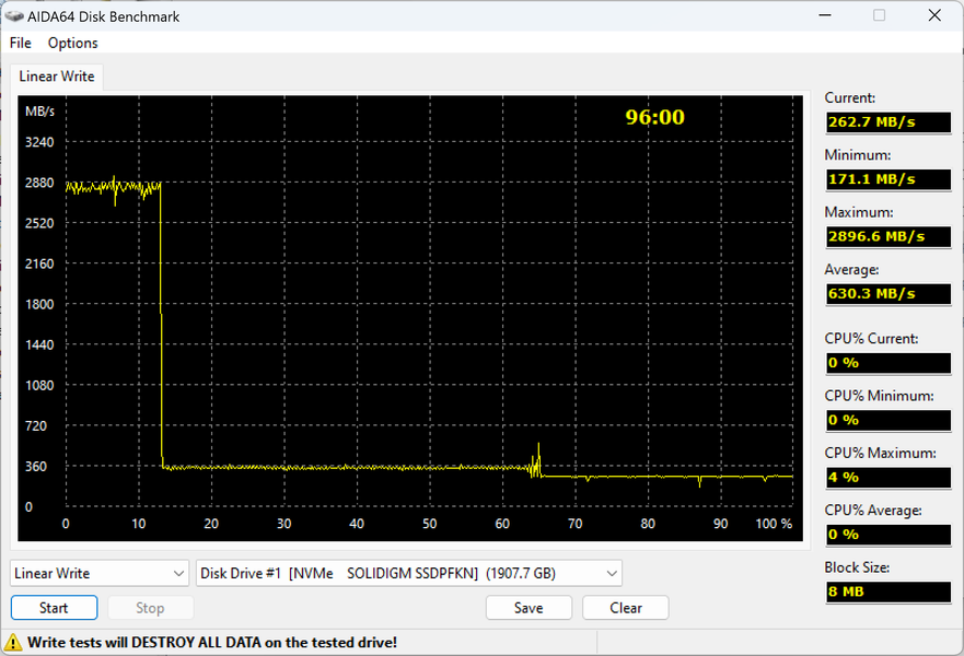 Так вел себя Intel SSD 670p. Определить, что это QLC, можно лишь по абсолютным значениям скорости прямой записи (а она тут именно прямая) в центральной части графика. Из TLC можно было бы «выжать» и больше, но более 300 МБ/с прямой записи и примерно 250 МБ/с на третьей стадии разгребания кэша на практике нормально, чтобы уже не замечать неудобств. Мало для тестов, но достаточно для жизни.