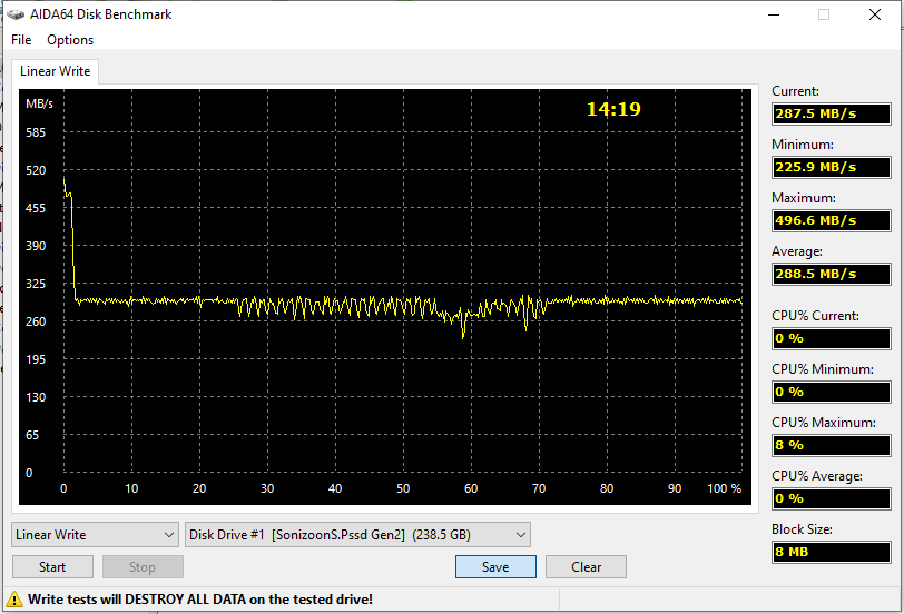 Для сравнения приводим график записи USB3.1 P.SSD на MLC. 500 МБ/с он не умеет, зато стабильно выдает более 400. В итоге на полную запись всех 256 ГБ расходуется менее 10 минут. USB3.2 T.PSSD с отключенным кэшированием был бы в полтора раза медленнее, а с включенным не укладывается даже в 22 минуты. Зато в штатном режиме небольшие объемы информации он способен записывать быстро. Особенно при наличии большого количества свободного места — когда емкость кэша максимальная.