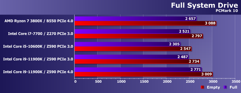 Новый комплексный PCMark 10 Full System Drive ориентирован на твердотельные накопители, так что способен загрузить работой даже самые быстрые SSD, не говоря уже о бюджетных. И включает в себя самые разные нагрузки — от запуска приложений, до простого копирования данных, так что дает полную информацию об усредненной «системной» производительностью SSD. Более подробную информацию можно получить из нашего краткого описания теста по ссылке, а сейчас — просто результаты. Как обычно — в двух состояниях: когда на SSD данных нет вообще (и SLC-кэширование может развернуться в полную силу) и когда на нем остается всего 100 ГБ свободного места (что куда более приближено к реальности, поскольку нынешние цены пока еще не слишком располагают к выбору емкости «с запасом»).