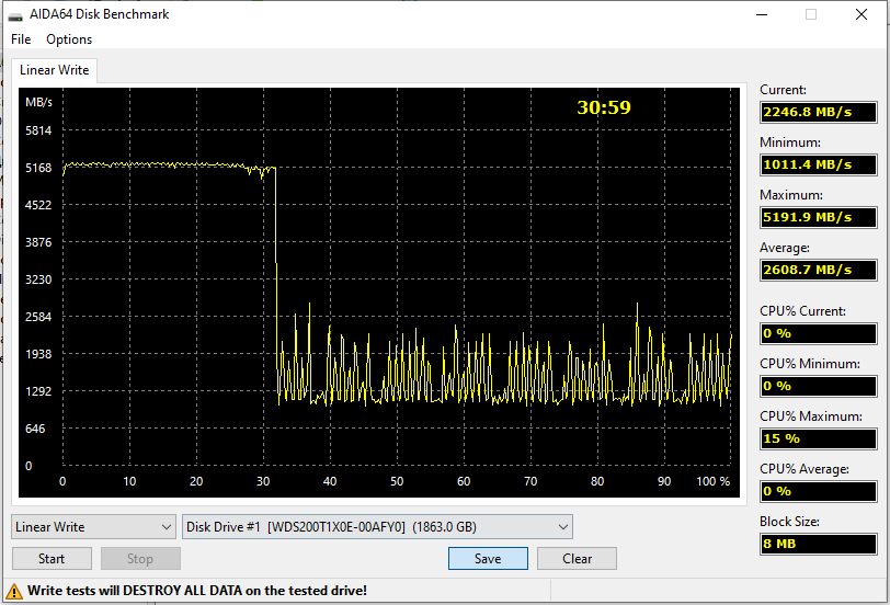 Правда вот идиллия мгновенно кончается, как только мы касаемся последовательной же, но записи. Black SN850 — один из самых быстрых SSD, способный выбраться за ограничения PCIe 3.0 и в этом случае (по крайней мере, в пределах SLC-кэша — а больше ничего низкоуровневые утилиты померить давно уже и не могут). Но об удвоении пиковых показателей хотя бы в подобном синтетическом случае речи уже не идет.