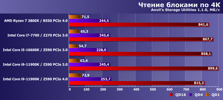 Многопоточная же запись на АМ4 стабильно замедлялась не только по сравнению с однопоточной там же, но и оказывалась медленнее, чем на любых платформах Intel. Оказывается, что это вовсе не обязательно — Core i9-11900K заставляет выкладываться на полную и сам SSD, и используемый интерфейс. Так что и тут проявилась «полезность» PCIe 4.0. Но только в этом случае.