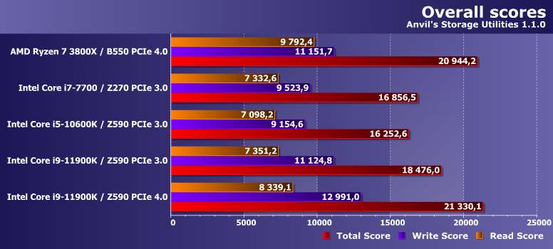 Что интересно, по обобщенному рейтингу данной программы (в который входят операции и с произвольной, и с последовательной адресацией) безусловным лидером в чтении оказывается платформа АМ4. Зато при записи ее результаты лишь примерно равны полученным на Core i9-11900K при подключении SSD к чипсету. А его «перенос» на процессорный интерфейс производительность повышает еще больше. Вывод? В целом повторение сказанного выше — на деле результаты многих бенчмарков на разных платформах в первую очередь говорят лишь о том, как сами бенчмарки работают на данных платформах. Поэтому сравнивать их в данном случае нужно очень аккуратно. Из этого можно сделать вывод, что полноценно протестировать именно интерфейсы и оценить «полезность» их модернизации практически невозможно — остается слишком много «белых пятен». И ладно б это касалось только низкоуровневых утилит со всеми их особенностями — иногда любопытные нюансы вылазят и в, казалось бы, самых простых и элементарных тестах.