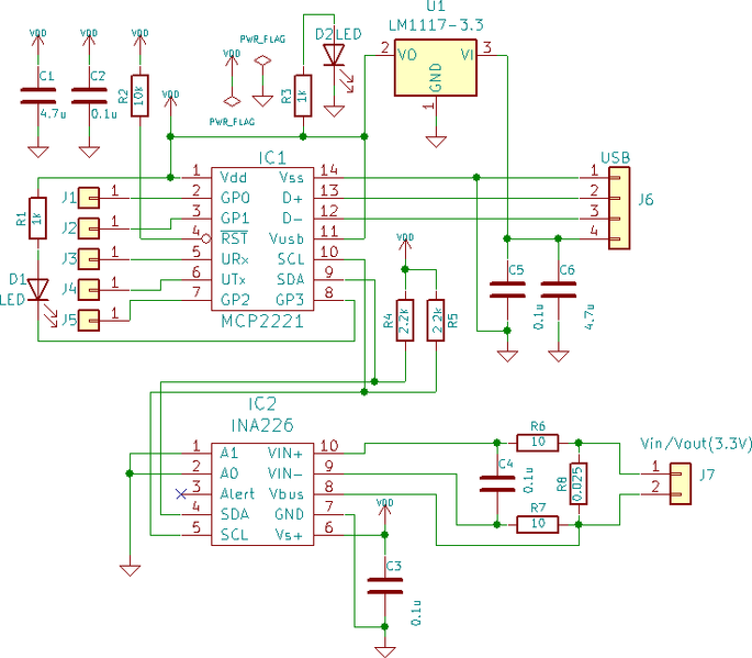Измерительный модуль мы решили сделать максимально универсальным и допускающим расширение функциональности, чтобы была возможность использовать почти все функции MCP2221, что, конечно же, было ошибкой и только увеличило размеры устройства измерения. Разработка этого модуля велась с помощью комплекса KiCad EDA (версии (5.1.9)-1). Принципиальная схема модуля: