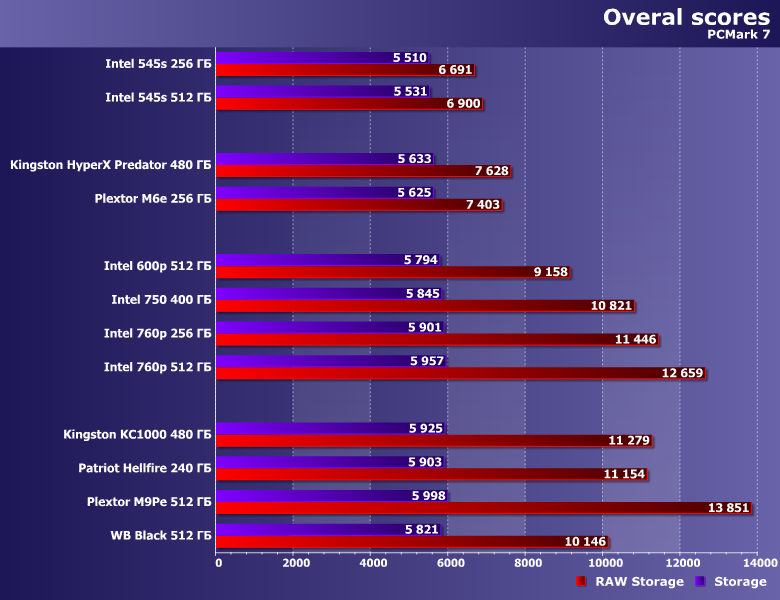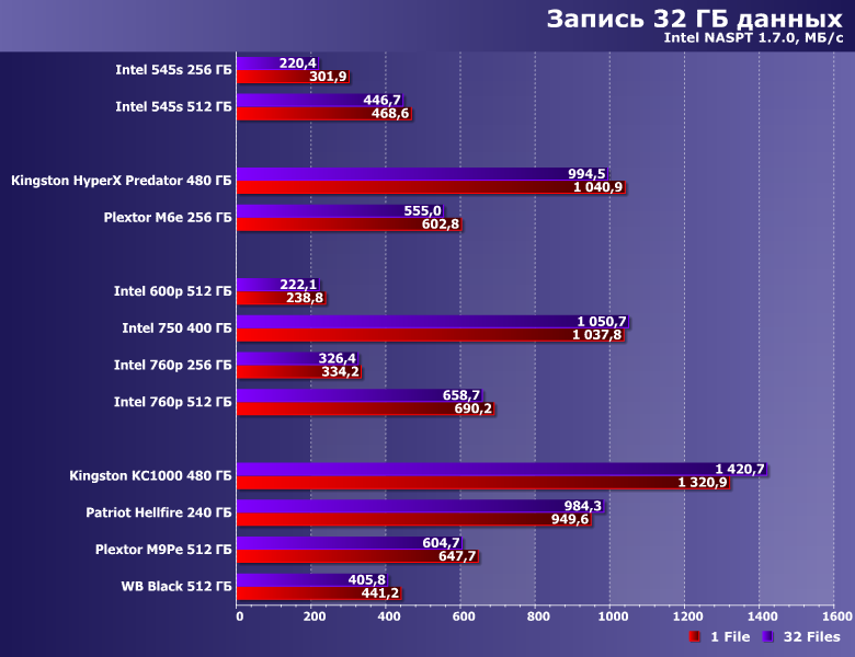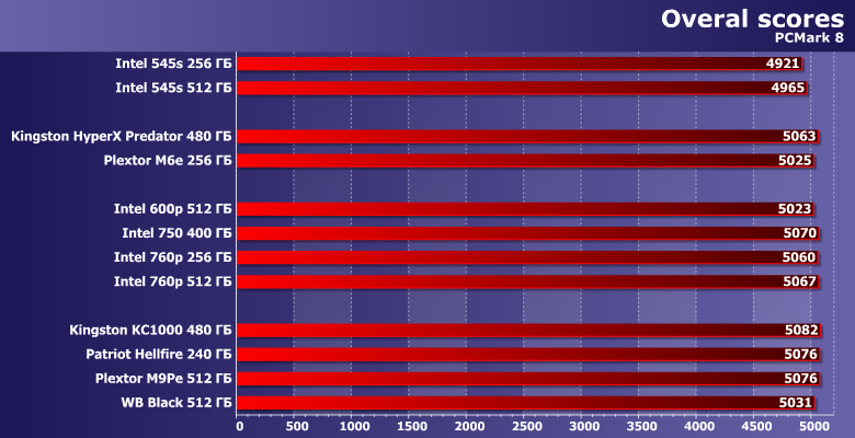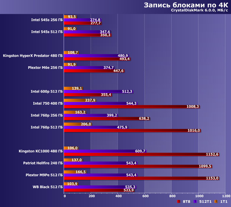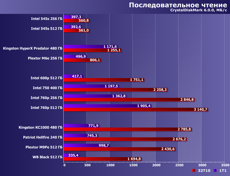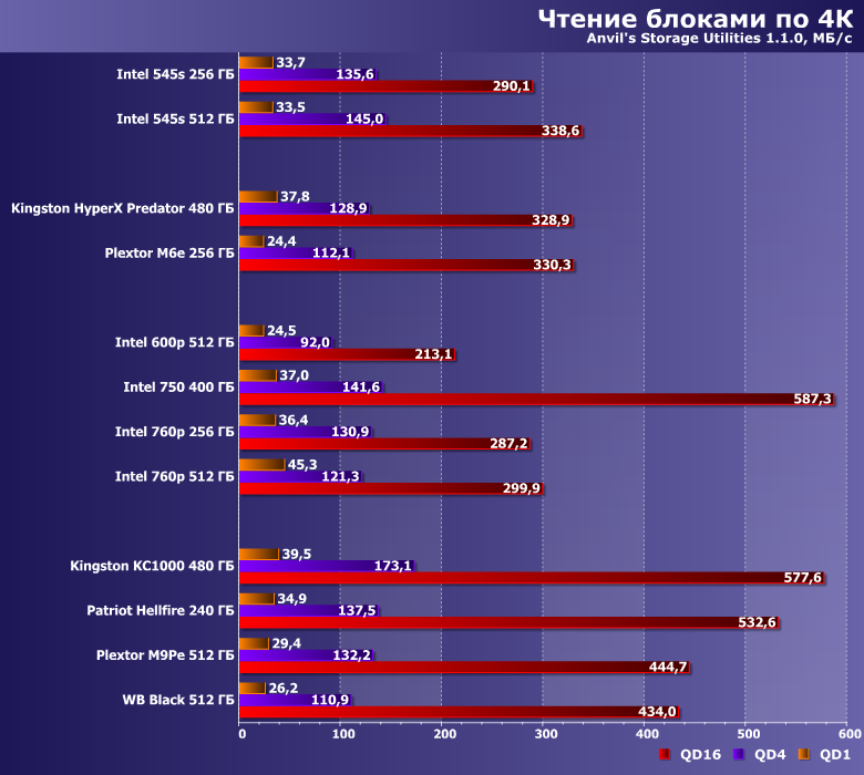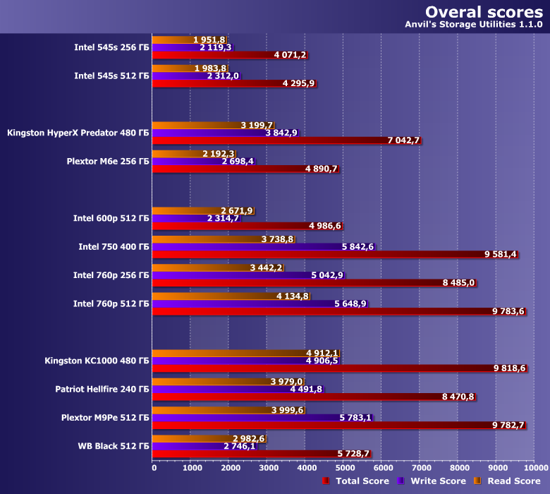 | Intel 545s 512 ГБ | Intel 600p 512 ГБ | Intel 750 400 ГБ | Intel 760p 512 ГБ | Kingston HyperX Predator 480 ГБ | Kingston KC1000 480 ГБ | Plextor M9PeG 512 ГБ | WD Black 512 ГБ |