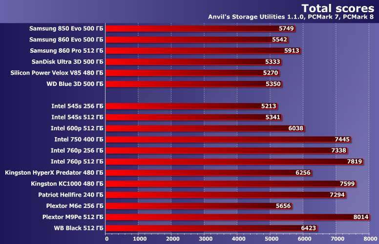 Общий же рейтинг протестированных на данный момент устройств, учитывающий также и результаты тестов высокого уровня, таков. Как видим, даже Intel 600p 512 ГБ хоть немного, но быстрее всех протестированных на данный момент SATA-устройств (впрочем, мы сомневаемся, что среди не протестированных найдется что-то быстрее, чем Samsung 860 Pro). Правда, настолько немного, что неудивительно разочарование некоторых потенциальных покупателей. Так что хорошо, что компания эту проблему исправила — устройства серии 760p по-прежнему недорогие, но и претензий к их производительности уже нет.