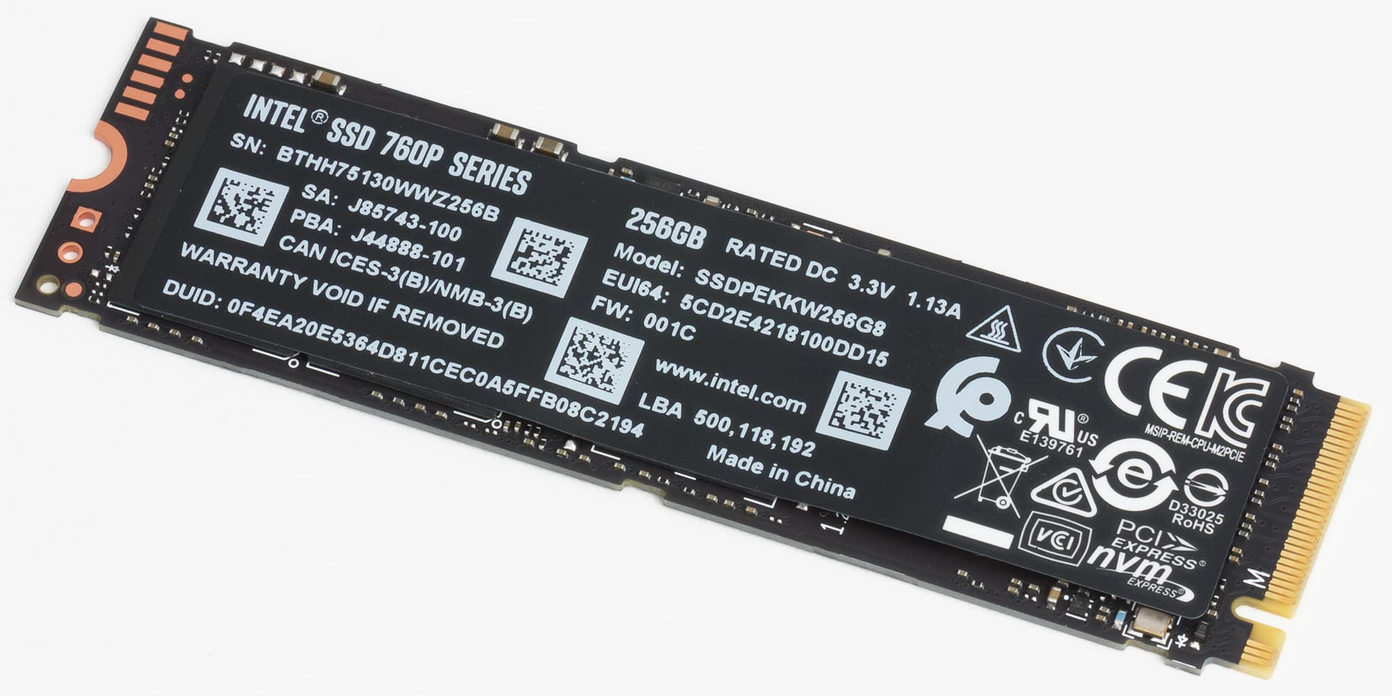 Но в прошлом году, решив проблемы с переходом на производство 3D NAND (результатом чего стало появление 64-слойной памяти с кристаллами по 256 и 512 Гбит, причем в накопителях, емкостью до 512 ГБ компания использует только первые), решено было заняться наведением порядка в ассортименте собственных решений потребительского класса. Начали с SATA-сегмента, поскольку там положение дел было самым сложным — актуальная на тот момент линейка Intel SSD 540s представляла собой чистый OEM-продукт стороннего производства. Поэтому были выпущены уже знакомые нам накопители семейства 545s — на новой памяти и контроллере Silicon Motion SM2259. А «сменщик» для 600p был запланирован на осень, причем изначально предполагалось, что останется он в «шестой» линейке (фигурировало название 650p). На деле накопители отложились до конца года, однако, похоже, компании «понравились» настолько, что получили название 760p. Это уже не топовое семейство — выше есть «оптановые» линейки 800p и 900p, но близко к тому.