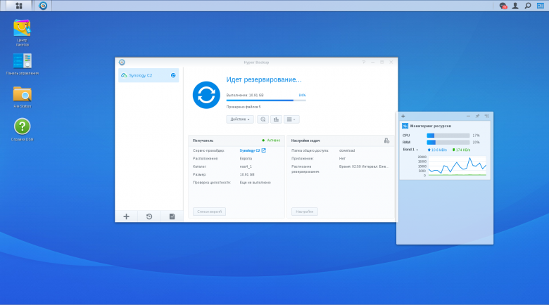 Сервис полностью интегрирован со штатным пакетом Hyper Backup, поддерживает блочный инкрементальный режим, хранение нескольких версий файлов, дополнительное шифрование на стороне приемника, хранение метаданных (в частности, прав доступа), пакетов и конфигураций сетевого накопителя. Кроме того, здесь есть функция контроля целостности архива (проверка возможности восстановления) и средства контроля за объемом.