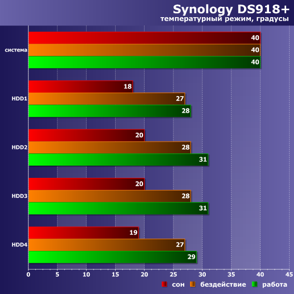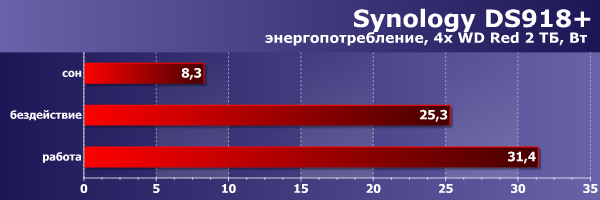При отсутствии нагрузки показатель снижается до 25 Вт, а в режиме сна с отключенным питанием дисков уровень энергопотребления составляет менее 10 Вт.