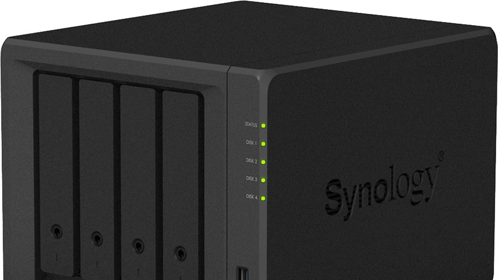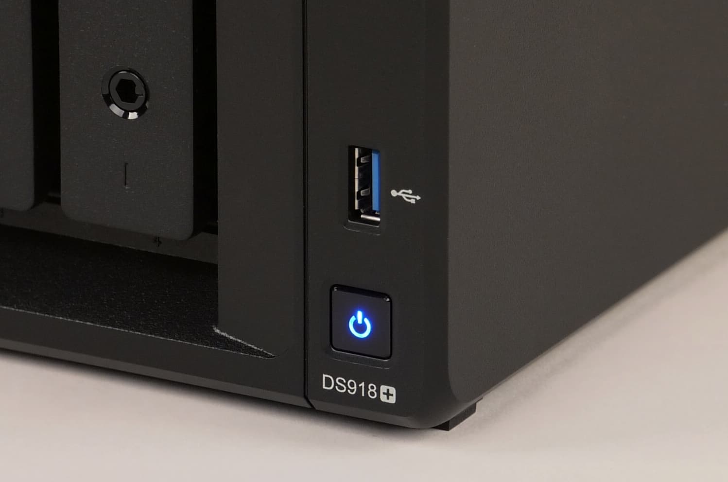 По правому ребру идет блок из пяти индикаторов — один общего статуса и четыре для каждого диска. Ниже находится фронтальный порт USB 3.0 и немного утопленная кнопка включения питания со встроенным светодиодом. Отдельной кнопки копирования с USB, как мы видели на прошлых устройствах, здесь нет. В определенном смысле это может быть компенсировано функцией USB Copy, которая позволяет настроить автоматическое копирование данных при подключении внешнего накопителя.