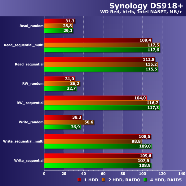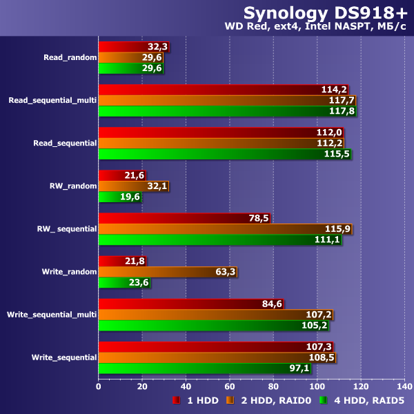 Исследование производительности сетевого накопителя проводилось совместно с жесткими дисками WD Red WD20EFRX объемом 2 ТБ. Наличие в устройстве отсеков для SSD, конечно, тоже интересно, но это требует подбора специальных тестов и методики. Мы постараемся вернуться к этому вопросу в следующих статьях, а в этот раз сосредоточимся на более традиционных сценариях. Основным инструментом для оценки скорости выступает Intel NASPT с шаблонами для работы с большими файлами. Настройки сетевого накопителя для теста минимальны и состоят преимущественно в выборе конфигурации дискового массива. Дополнительные пакеты в базовой группе тестов не используются.