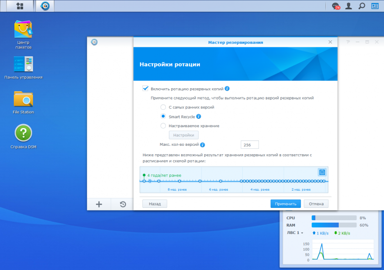 Hyper Backup является более сложной программой, которая использует специальный формат хранения резервных копий, обеспечивающий версионность, дедупликацию и другие возможности. Неудивительно, что с ней скорость создания резервных копий немного ниже. А вот восстановление проходит почти без потерь — примерно на 120 МБ/с.